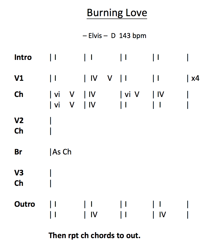 Chord charts written out using this system can be easily transposed on the fly, if you need to play in different key - to suit a different singer, for example. If we take our example from the previous page, Burning Love,