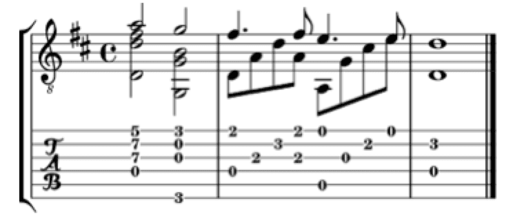 Tablature (or tabulature, or tab for short) is a form of musical notation indicating instrument fingering rather than musical pitches. To read the tab, each string is shown visually as you would see it looking down as you play. So, the first chord, D, is shown fingering the first string at the fifth fret, the second at the seventh and so on.